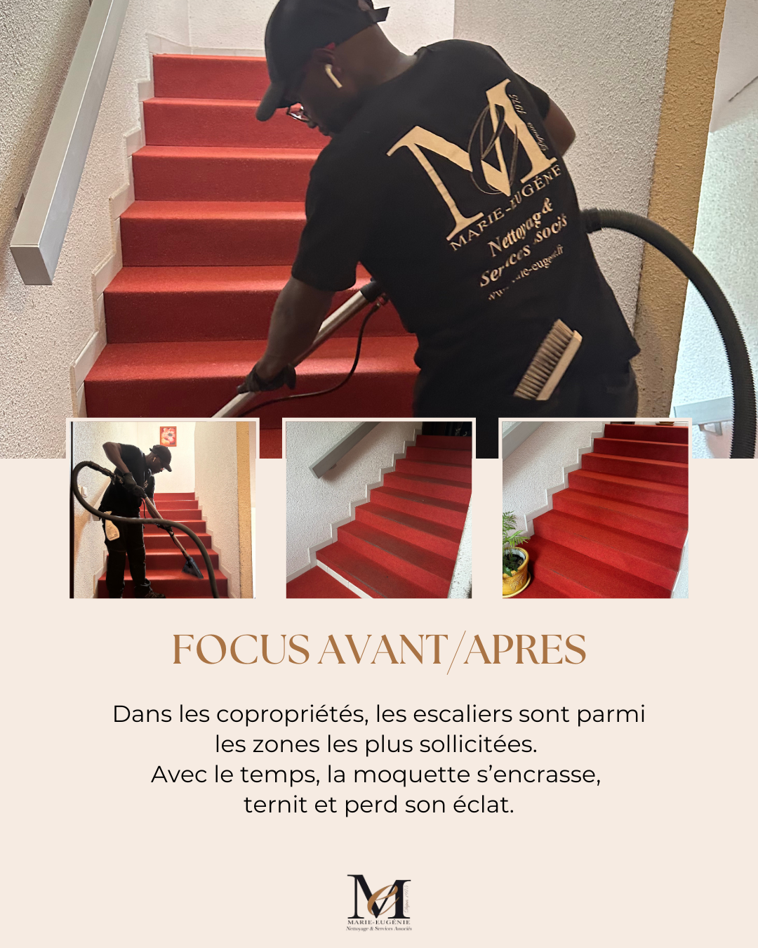 Après : moquette ravivée, couleur restaurée, escaliers plus propres et plus accueillants